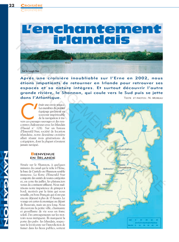 sur le Shannon, en Irlande, entre Carrick et Clonmacnoise, par Jamestown, Dromod et Athlone et la succession des grands lacs : Lough Key, Lough Corry, Lough Tap, LoughBoderg, Lough Bofin et Lough Ree