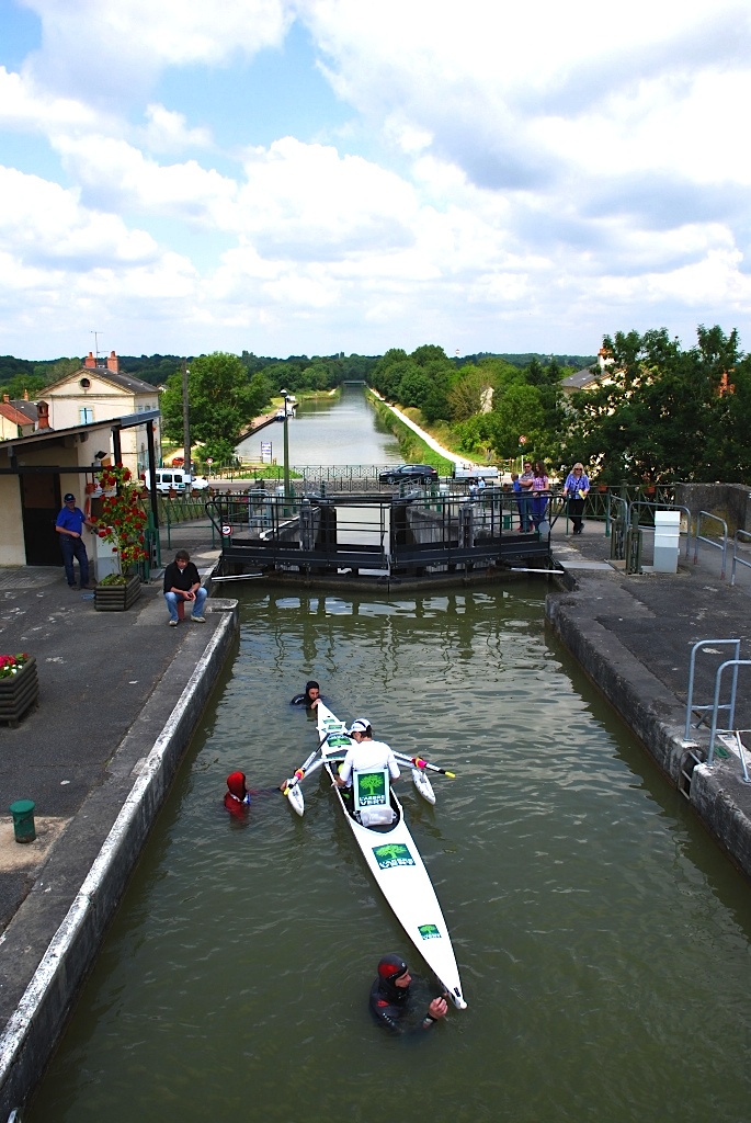 Juste avant le pont-canal, nous avions franchi la double écluse. Nathalie était dans son bateau, veillée par 3 pompiers. En haut, ils avaient plus de 9 m d’eau sous les palmes. Mieux vaut ne pas laisser tomber son tuba au fond du bassin… Nous craignions un peu que les gaz d’échappement ne les incommodent, mais tout s’est bien déroulé du début à la fin.